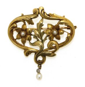 Broche OR 750 ancienne. Motifs fleurs, 1/2 perles fines.