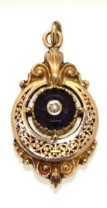 Pendentif OR 750 ancien, pierre violette synthétiques et demi-perles fines.
