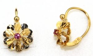 Boucles d’Oreilles OR 750 jaune Dormeuses Rubis ciselées.