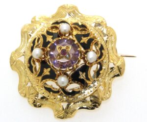 Broche OR 750 ancienne pierre violette et 1/2 perles fines. (diamètre 38mm)