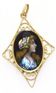 Pendentif OR 750 ancien Porcelaine de Limoge peinte à la main et émaillée. (34x25mm)