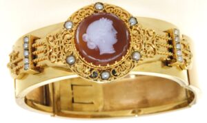 Bracelet OR 750 ancien semi-rigide camée et 1/2 perles fines. Largeur 20mm ((60x56mm)