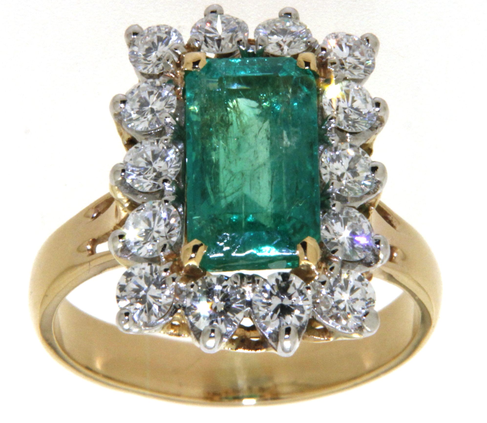 Bague OR 750 et platine 1 Émeraude (11,6×6,7mm) d’environ 3ct entourée de 14 diamants taille brillant E-F – VS pour un poids total d’environ 1,40ct. Doigt 57