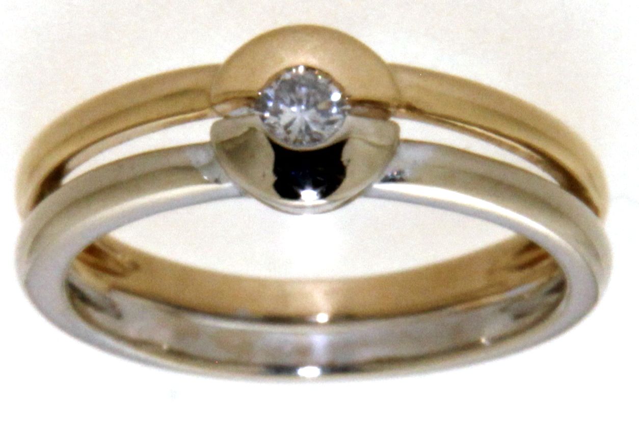 Bague OR 750 BICOLORE solitaire diamant 0,12ct double anneaux diamant serti demi-clos. Doig 51