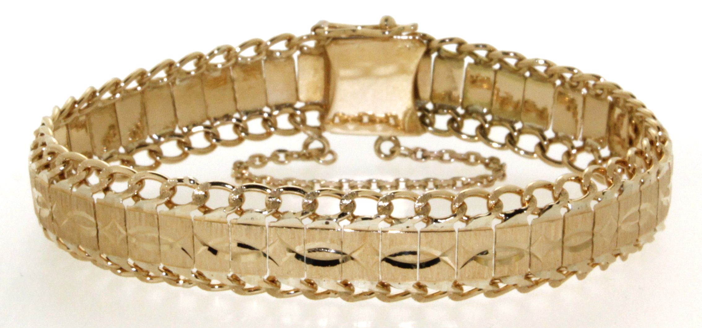 Bracelet OR 750 gourmette et plaquettes ciselées. Largeur 11mm – Longueur 17cm