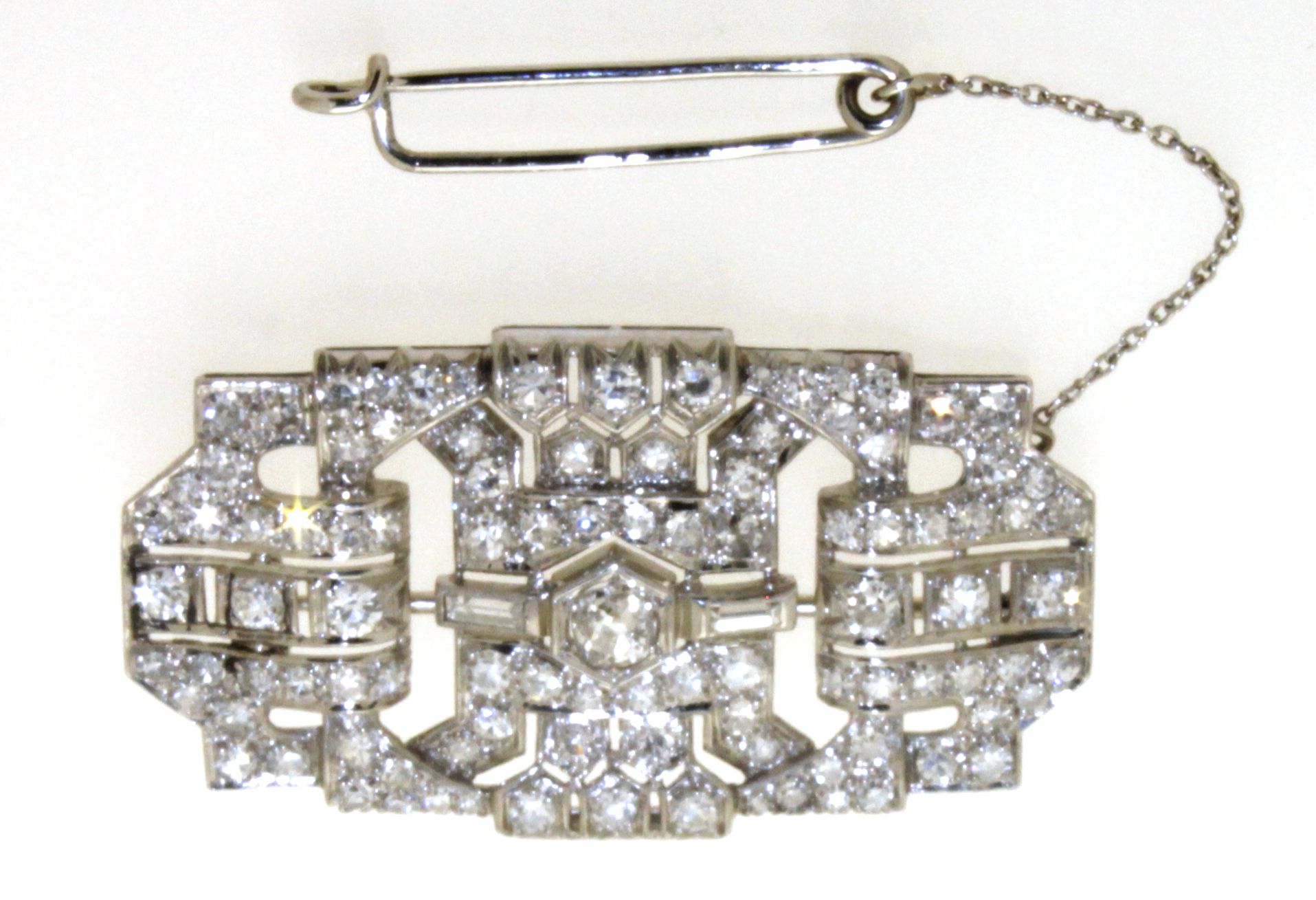 Broche OR 750 gris et Platine des années 1920 , diamant taille ancienne, centre environ 0,25ct + 2 diamants baguette environ 0,14ct pavage de 100 diamants taille ancienne pour un poids total d’environ 4ct.